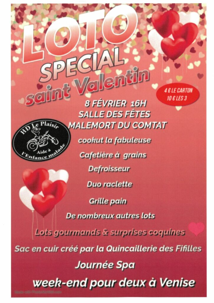 HD Le Plaisir – Loto Spécial St Valentin dimanche 8 février Agenda des festivitésPar Mairie de Malemort29 janvier 2026HD Le Plaisir organise un Loto spécial St Valentin le dimanche 8 février à partir de 16h00